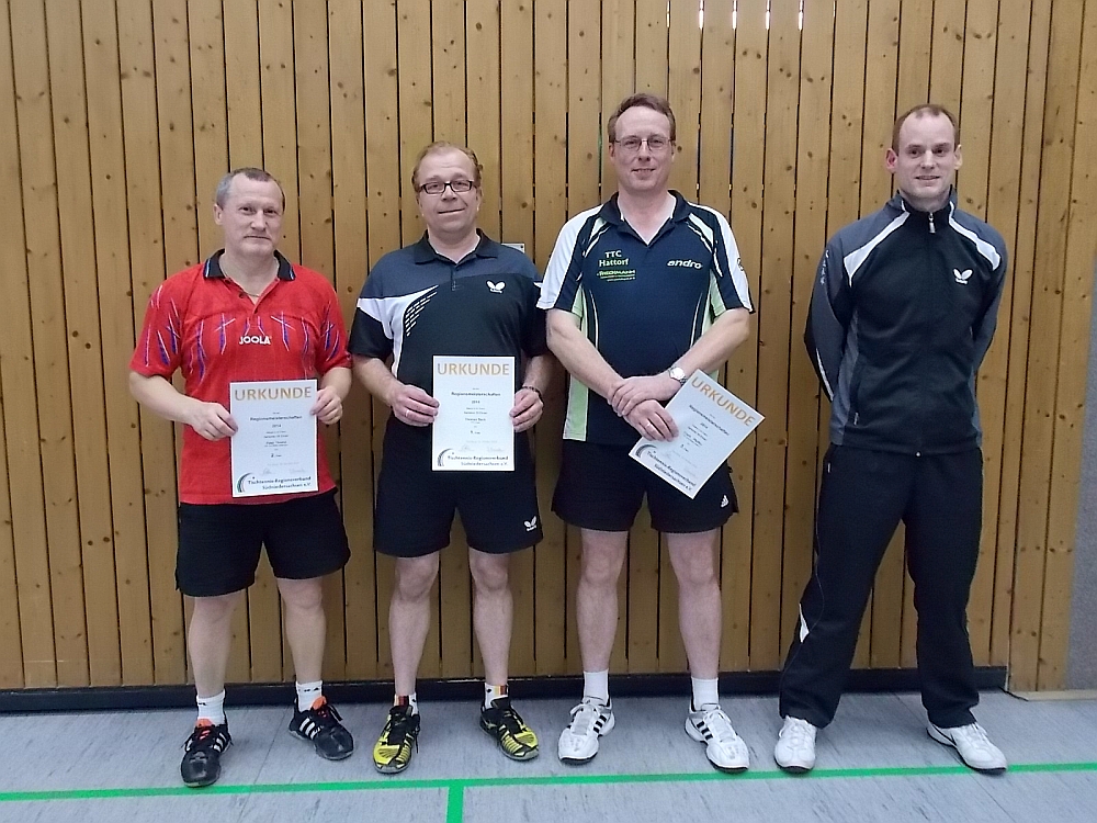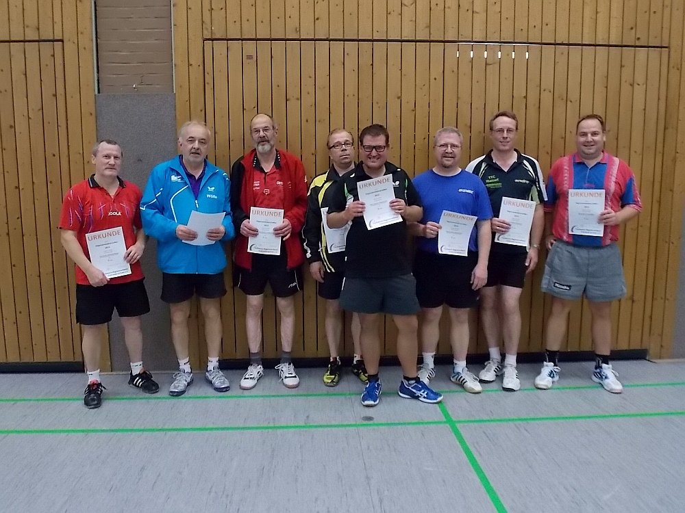 RM2014 Senioren Alle TeilnehmerAm 18. Oktober 2014 wurden die ersten Seniorenmeisterschaften des Tischtennis-Regionsverbandes Südniedersachsen in der Nicolai-Turnhalle in Herzberg ausgetragen. Nach einer kurzen Begrüßung durch den Regionsverband und den TTC Herzberg begannen die 14 Teilnehmer im Modus „Jeder gegen Jeden" in den Altersklassen Ü40, Ü50, Ü60 und Ü80 mit ihren Gruppenspielen. Es wurde um jeden Punkt und Satz gekämpft und es gab spannenden und hochklassigen Sport zu sehen.